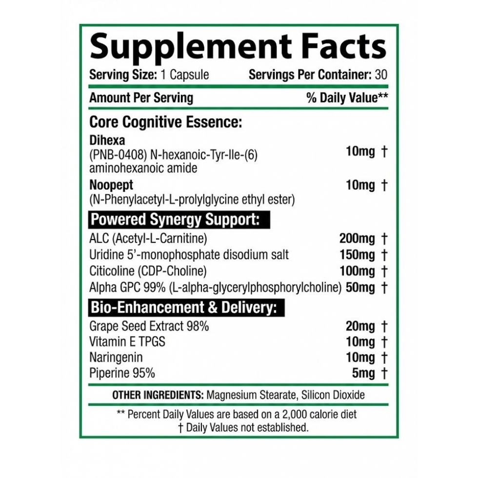В основе рассматриваемого продукта лежит дигекса (N-гексановая-тирозин-изолейцин-(6)аминогексановая амид). Это олигопептид, получивший в научных кругах и кругах биохакинга репутацию одного из самых мощных нейрогенных агентов. Его действие поразительно: дигекса была разработана для помощи при дегенеративных заболеваниях головного мозга, но у здоровых людей она действует как мощный катализатор образования новых синапсов.